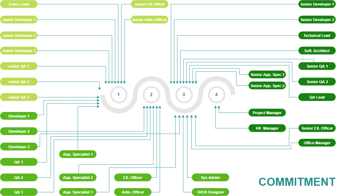 We address this by defining four proficiency levels for each competency. The expected behavior at each level increase in complexity, ranging from the introductory / basic levels to the advanced and expert levels.
