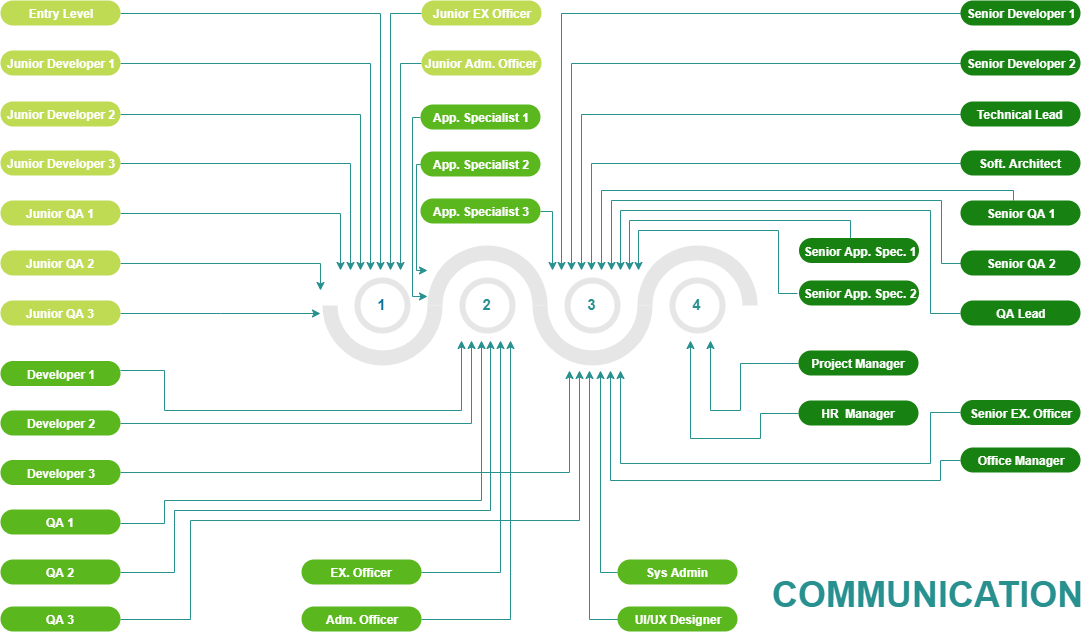 • Sets up processes to improve information flow, is engaged in sharing and seeks to develop mutual understanding.