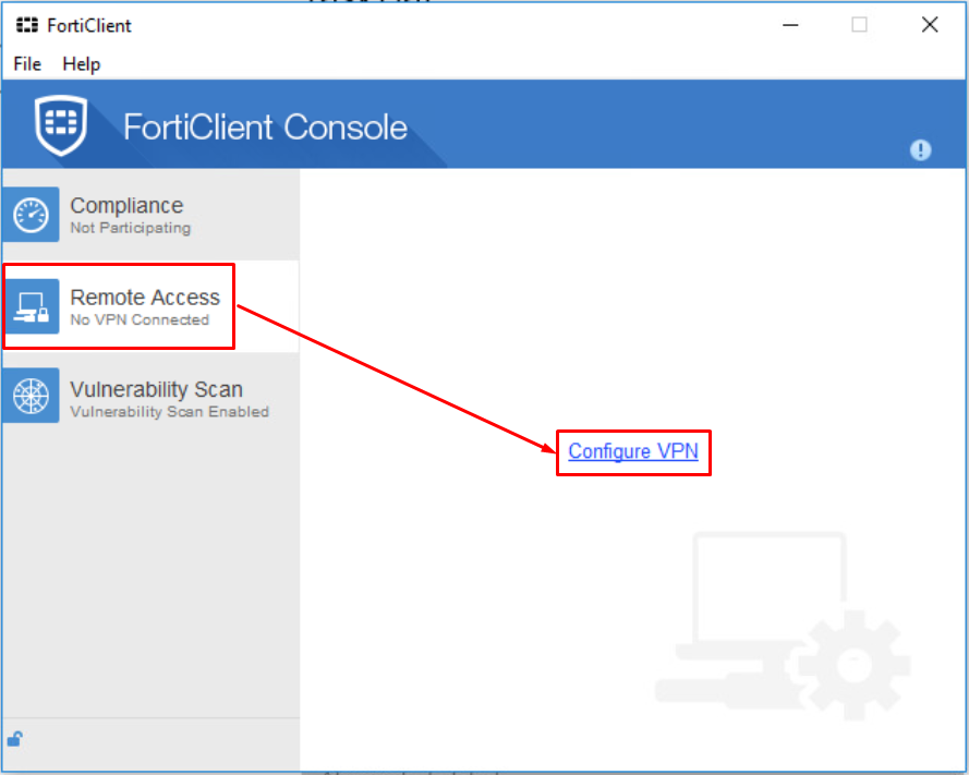 Open FortiClient – click Remote Access – click Configure VPN