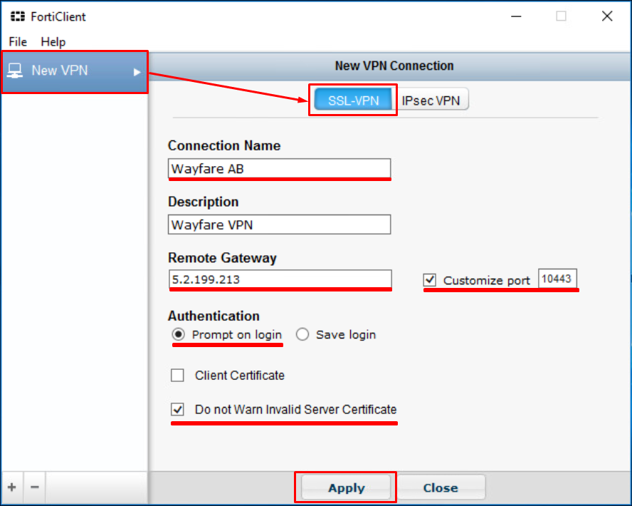 Complete the SSL-VPN connection information: