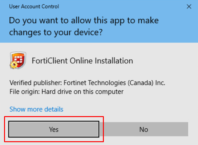 Save and Run or just Run “FortiClientOnlineInstaller.exe” and allow this app to make changes in the UAC window