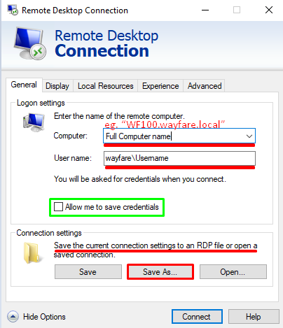 You can upload your *.rdp file into One Drive or send it on your email for quick transfer and access from other Wayfare devices but be careful not to save credentials by ticking “Allow me to save credentials” on the shared connection file.