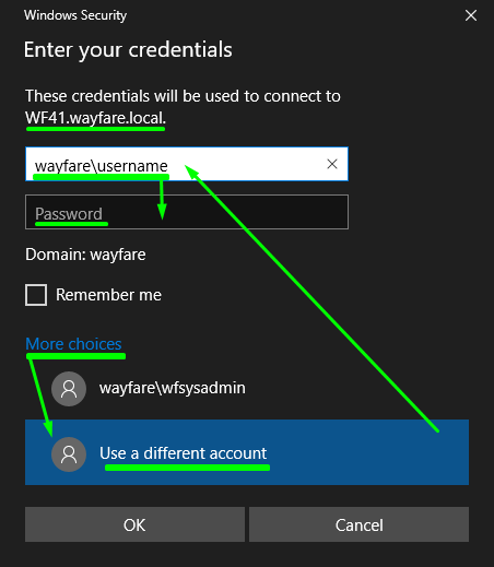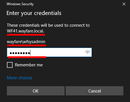 On the Remote Desktop Connection window click – “Connect” – check your domain username (or choose “More Choices” to enter your username “wayfare\username”) and enter your Password à click “Ok”.