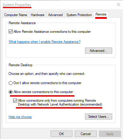 Enable RDC connections to your workstation by going to Windows Explorer – right click on “This PC” – PropertiesRemote SettingsRemote tab – set your Remote Desktop settings to “Allow remote connections to this computer” and “Allow connections only from computers running Remote Desktop with Network Level Authentication (recommended)”