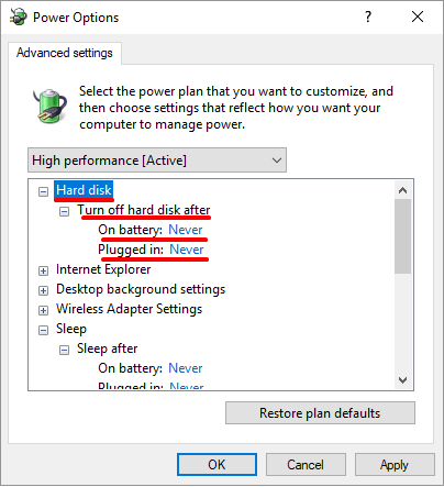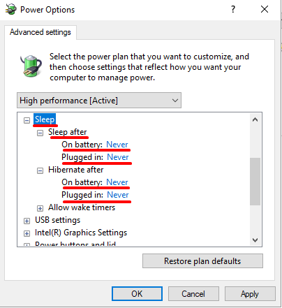 If you use VPN and Remote Desktop Connection to connect and control your workstation make sure your PC is powered on, connected to the network (preferably a cable connection) and the power settings are set to Never for “Turn off hard disk”, “Sleep” and “Hibernate” (you should also setup and proceed to restart your workstation and install Windows Updates when requested not scheduled or snoozed)