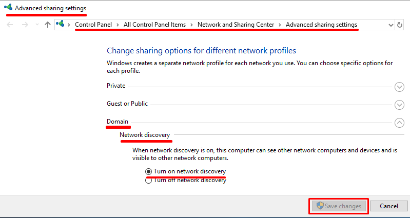 I recommend, but it is not always necessary (in cases of miss-auto-configuration network settings or network settings requiring troubleshooting) to Turn ON Network Discovery for Domain network only.